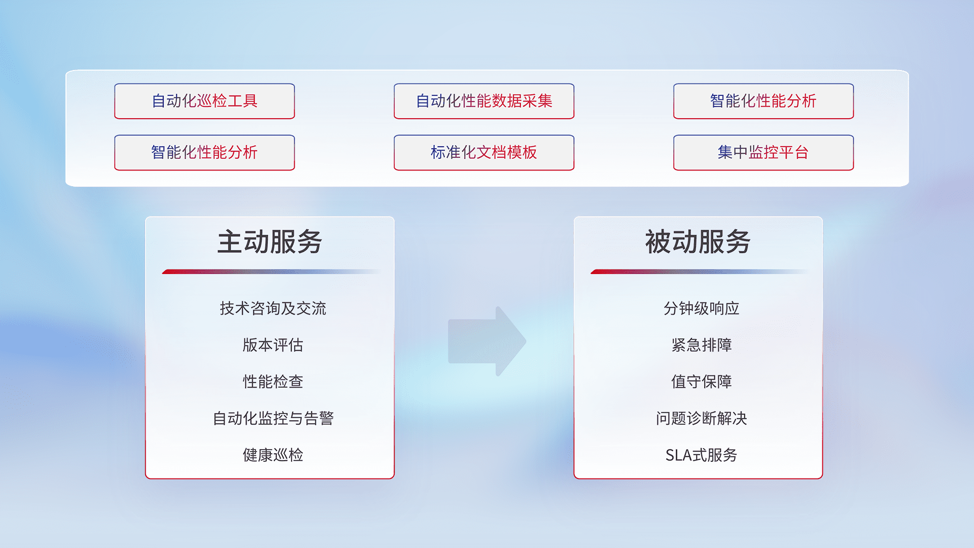 智能化工具和标准化文档,,,,保障服务质量,,,提供主动服务(包含技术咨询、、版本评估、、、性能检查、、、、自动化监控与告警、、健康巡检)和被动服务包含(分钟级响应、、紧急排障、、、、值守保障、、问题诊断解决、、SLA服务)。。